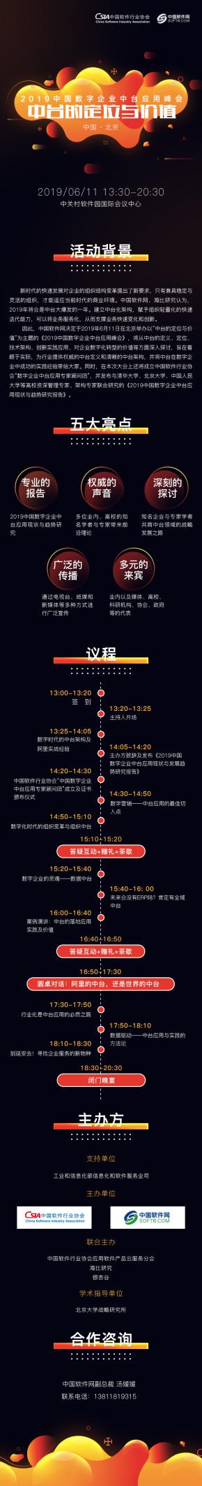 2019年6月11日,由中国软件网主办的“首个中国数字企业中台应用峰会”将在“世界互联网中心”北京中关村软件园召开。峰会将围绕“中台的定位与价值”展开讨论,行业权威专家、学者、中台提供商、用户及合作伙伴300余人参加。大会旨在“洞察产业趋势,达成行业共识,搭建合作平台”。