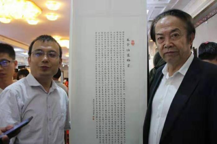 北京金台艺术馆馆长,雕刻大师,第八届、第九届、第十届政协委员、第十一、十二届全国政协常委袁熙坤大师与吴海友院长在其每字1.2厘米小楷作品《朱子治家格言》合影留念。