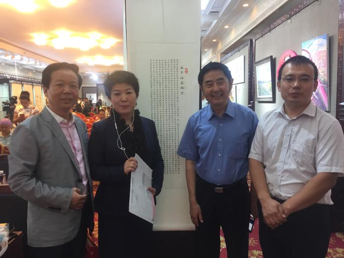 高继红秘书长与中国文联副主席,中国书协理事罗先生和新华社《半月谈》常务副总经理王京忠先生与吴海友院长再其作品前合影留念。