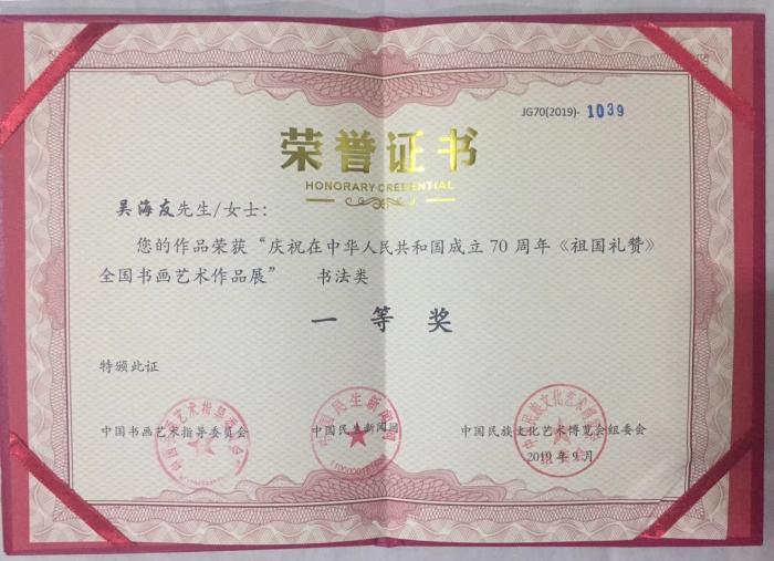 2019年9月6日 为庆祝中华人民共和国成立70周年,深入贯彻文化兴国精神,弘扬民族优秀传统文化,在北京长安街中国民族艺术馆举办庆祝中华人民共和国《祖国礼赞》全国书画作品展隆重开幕。书画名家吴海友院长每字1.2厘米小楷《朱子治家格言》入围并与国画大师范曾先生,中国书法家协会现任主席苏士澍先生,赵忠祥先生,中国文联副主席,中国书协理事罗杨先生,作品共同展出。并荣获书法组全国“一等奖”。