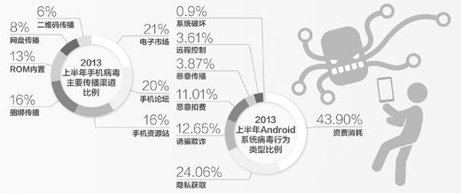 水货市场的渠道也不容忽视。随着水货手机销售的增长,少数恶意软件开发者与部分水货商结成利益联盟,在水货手机ROM内置恶意软件,导致ROM渠道病毒感染用户数大幅增长。此外,自去年起开始走红的二维码也成为新兴的传播渠道。