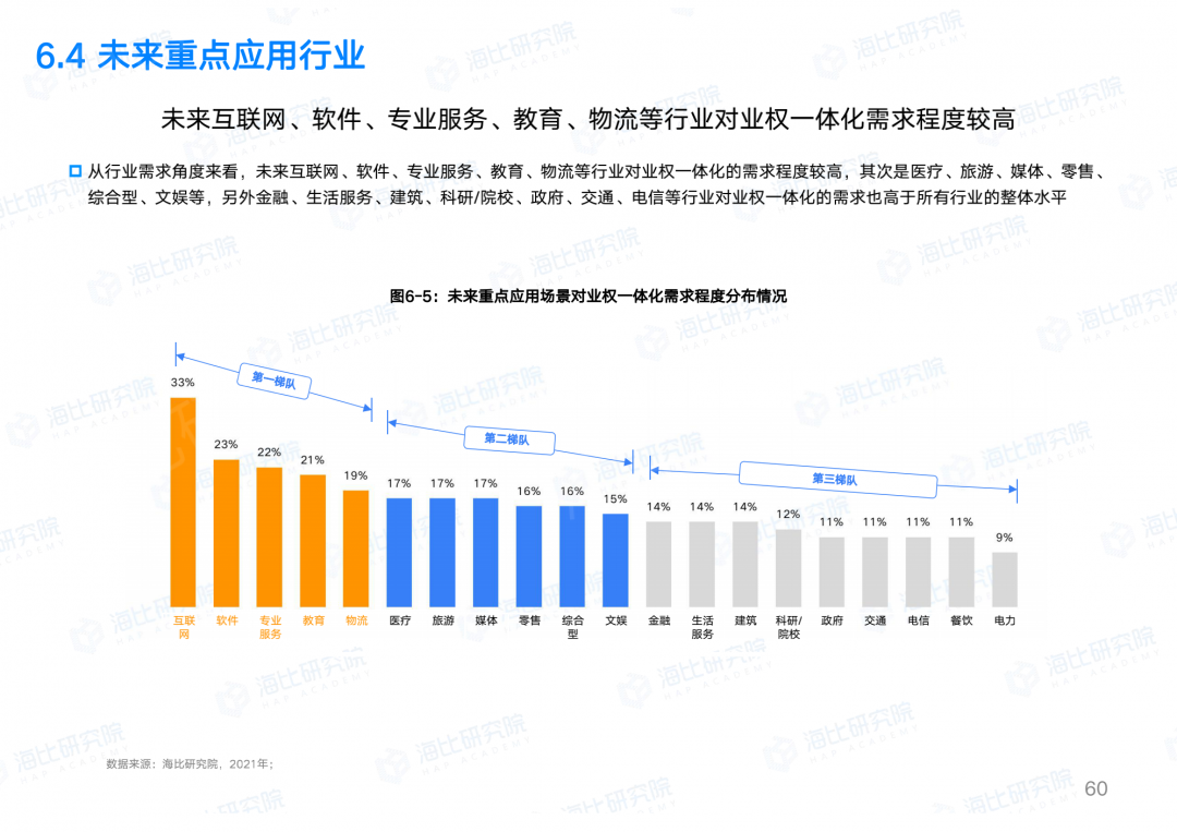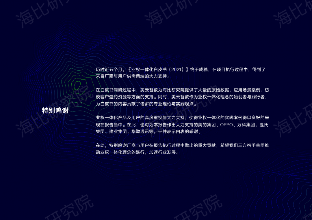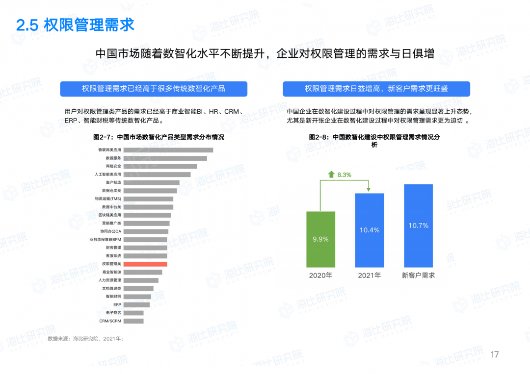 为全面梳理业权一体化市场情况,海比研究院联合中国软件网、中国软件行业协会、美云智数共同发布《业权一体化白皮书(2021)》。希望通过本次研究对权限管理领域做一个全景式的梳理与展现,分析权限管理发展历程、业权一体化产生的原因、业权一体化产品与实施路径、典型案例、未来趋势等,为业内全面了解第四代权限管理产品提供一个窗口。